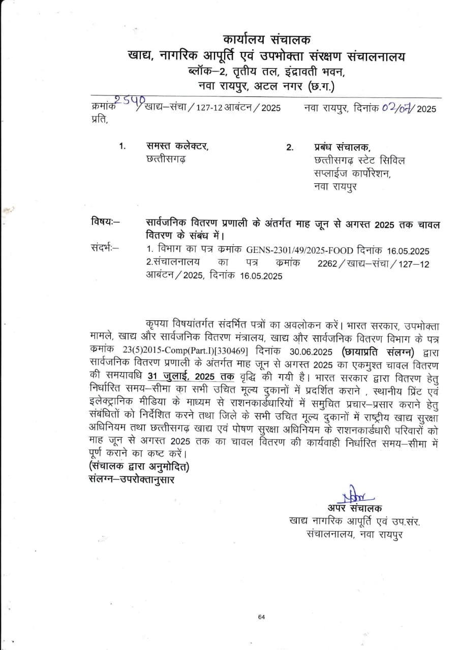 सार्वजनिक वितरण प्रणाली के तहत जून से अगस्त 2025 तक चावल वितरण की समयसीमा बढ़ाई गई