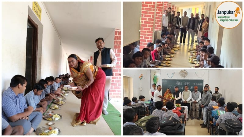 शासकीय बालक उच्चतर माध्यमिक विद्यालय रामानुजनगर में पवन सिंह ने न्योता भोज का कराया गया आयोजन