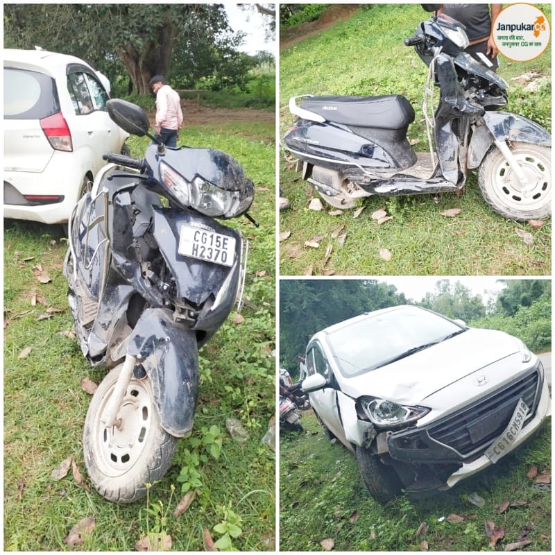 भैयाथान: ग्राम पंचायत बंजा अटल चौक पर कार और स्कूटी में जबरदस्त भिड़ंत, बाल-बाल बचे लोग