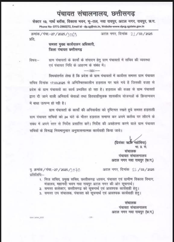 ग्राम पंचायत सचिवों की हड़ताल पर प्रशासन का चाबुक – 24 घंटे में काम पर लौटें वरना होगी कड़ी कार्रवाई,आदेश जारी…
