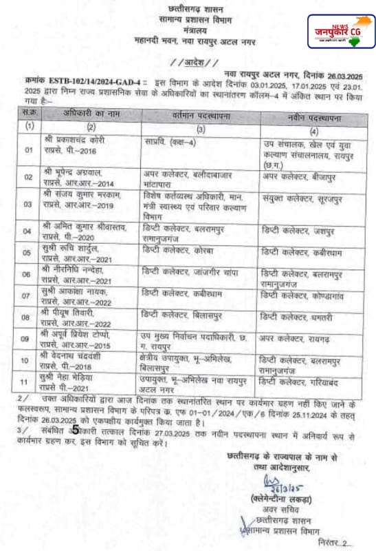स्थानांतरण आदेश की अवहेलना पर कार्रवाई: छत्तीसगढ़ सरकार ने 26 मार्च को 11 अधिकारियों को एकपक्षीय कार्यमुक्त किया..