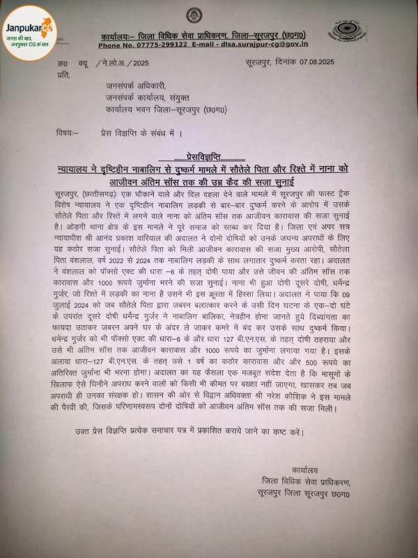 सूरजपुर: सौतेले पिता-नाना को नाबालिग से दुष्कर्म पर उम्रकैद