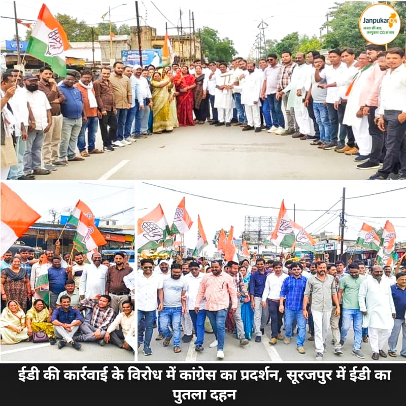 सूरजपुर में ईडी की कार्रवाई के विरोध में कांग्रेस का प्रदर्शन